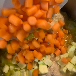 Heat the oil in a 6 quart or larger pot. Dice and sauté the onions and garlic. Add the sliced Celery to the pot, Chop the baby carrots and place them in the pot. Dice the zucchini and add it to the pot. Dice the chicken and add it. Add the salt. Add the dill and parsley preferably in a net bag. Add 6 cups of water and bring to a boil. Lower to medium low heat and cook for 45-60 minutes. Remove the dill and parsley. Mix 1 cup flour with 2 cups hot water stir until it becomes a slurry. pour the slurry into the pot. Mix. Cook for a 15 minutes on low. The soup should thicken Enjoy!