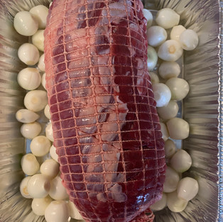 Place the roast in a 9x13 pan. Pour in the beef broth and wine. Season the roast with salt, pepper, paprika, and garlic powder. Peel pearl onions and add them to the pan. Peel potatoes and largely dice them and add them to the pan. Cover tightly and bake at 350° for 3 hours.