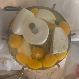 Heat the oven to 400. (put a counter liner on your counter) Place the oil in a 9x13 Pyrex and place it in the oven. Peel your potatoes and place them in a bowl of cold water. Place the ‘S’ blade in your food processor along with the onions and all the other ingredients. Pulse 8x until it turns into mush.( don’t leave food processor on for more than one minute you don’t want to whip the eggs) . Leave the mush in the food processor. Spill the water out of the bowl with the potatoes. Next switch your ‘S’ blade for the shredding blade and shred your potatoes. Pour the whole mix into the 9x13 Pyrex and bake at 400° until the top is browned (about 1 hour and 15 minutes)